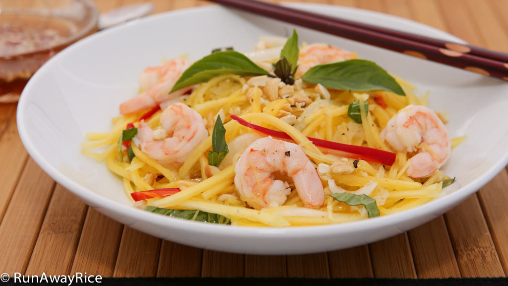 Refreshing and light, this flavorful salad is made with unripened mangoes–which is crunchy and slightly tart, succulent shrimp, fragrant fresh herbs and spicy jalapenos and then drizzled with a zesty and sweet fish sauce dressing. If you love these bold flavors and textures, you’ll want to try this recipe. If you’re familiar with these flavors and drooling already, my work here is done! 🙂 Hope you love the recipe!